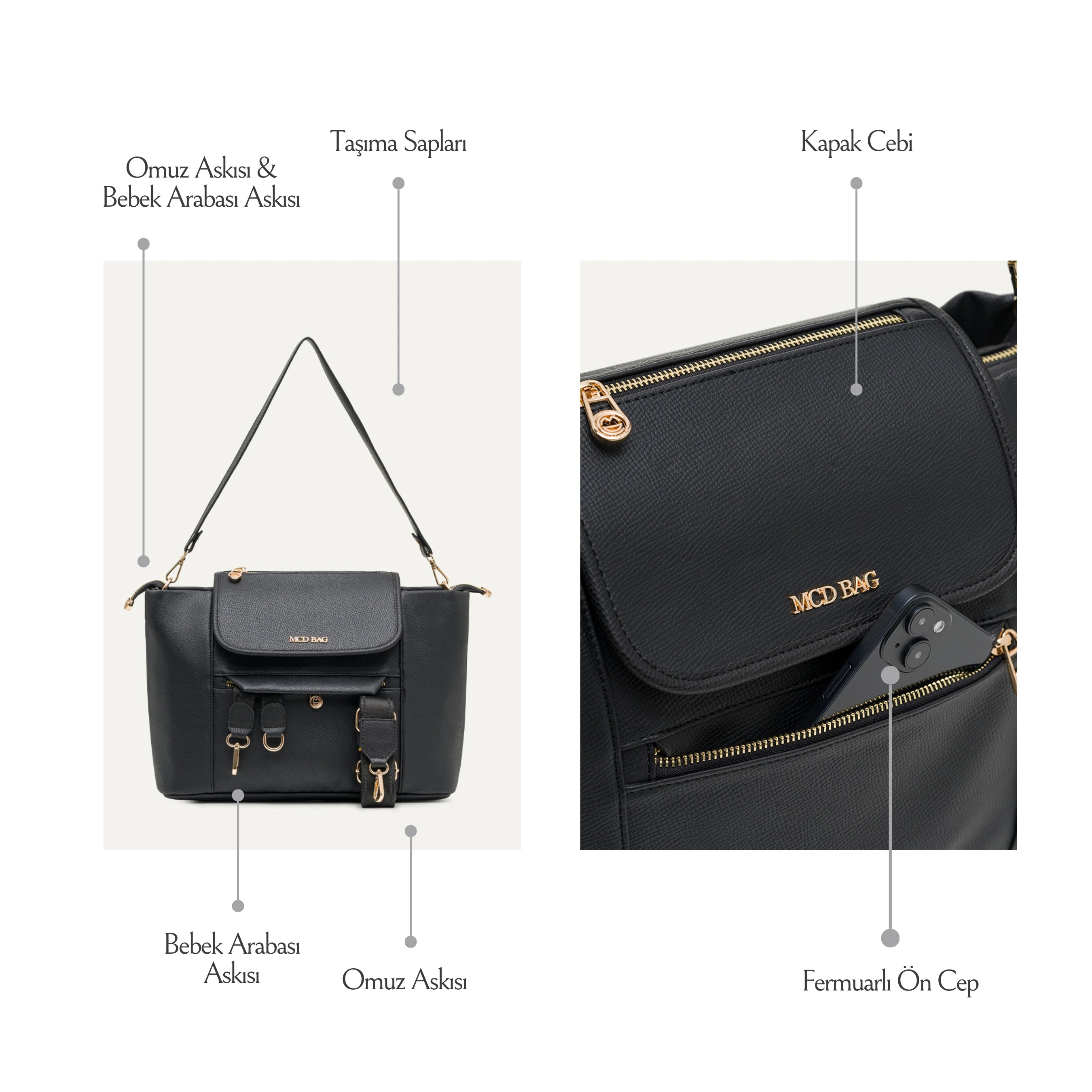 Siyah KumaşLuna bebek arabası organizer çantası, hem elde hem omuzda hem de bebek arabasında taşınabilme özelliğiyle son derece pratik ve kullanışlıdır. Tam bir anne seyahat dostu olan bu çanta, bebek ve anne ihtiyaçlarını düzenli bir şekilde taşımanızı sağlar, hem şık hem de fonksiyonel tasarımıyla günlük hayatınızı kolaylaştırır.