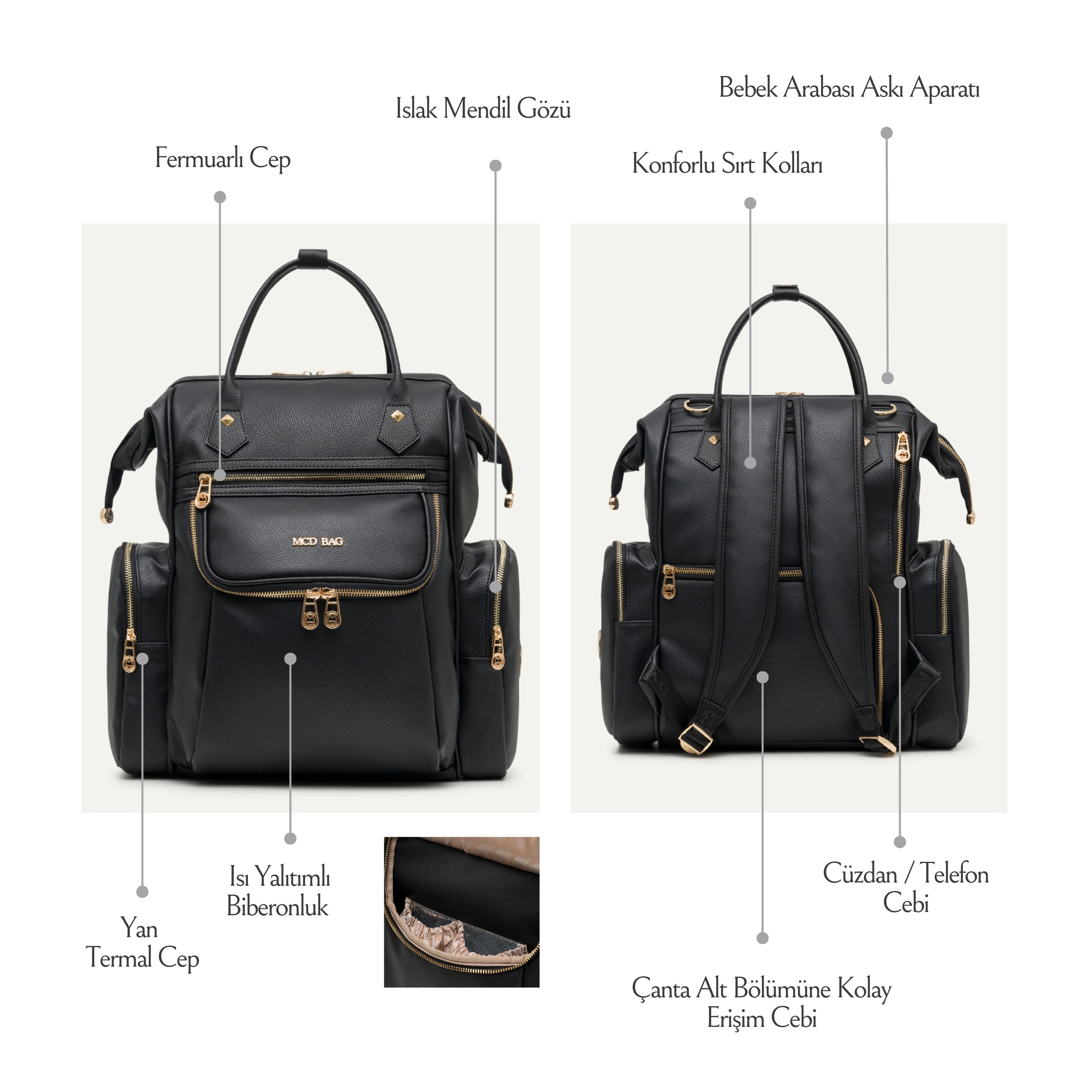 Modern ve şık tasarımıyla hem annelerin hem de babaların rahatlıkla kullanabileceği Vista, ebeveynlerin hayatını kolaylaştırmak için tasarlandı. Termal bölümleri sayesinde mama ve içecekleri ideal sıcaklıkta tutarken, pratik ıslak mendil gözü ve çantanın içine kolay erişim sağlayan özel bölmesiyle her ihtiyaca anında ulaşmanızı sağlıyor. Geniş iç hacmi, tüm bebek eşyalarını düzenli bir şekilde taşımaya olanak tanırken, dayanıklı ve su geçirmez kumaşı ile her hava koşulunda güvenle kullanılabilir.