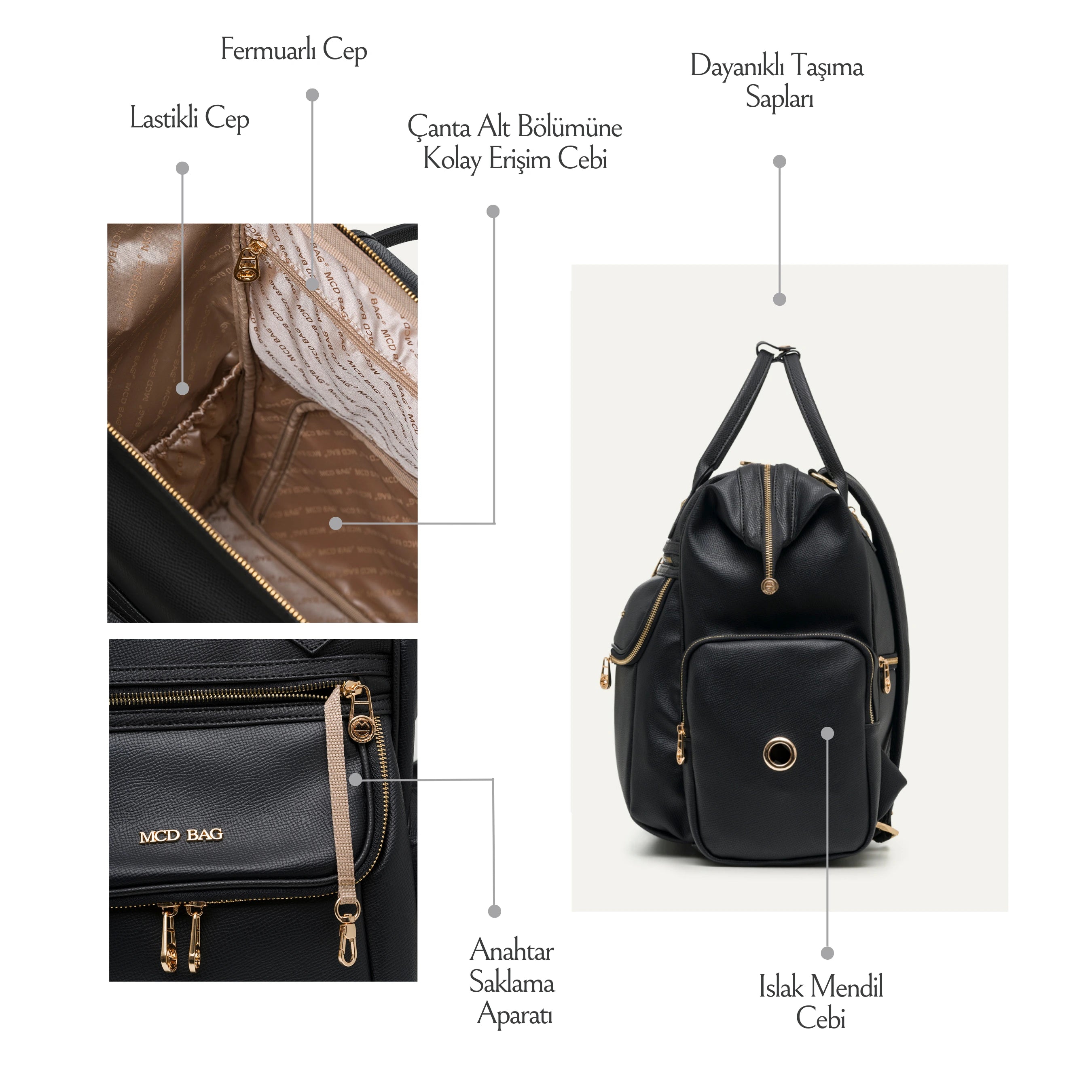 - Toplam 10 bölme: 4 lastikli, 6 fermuarlı cep